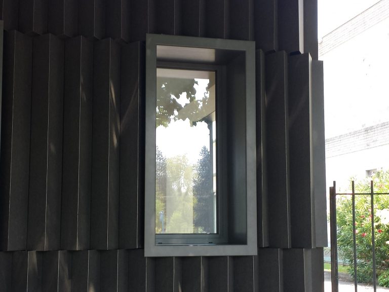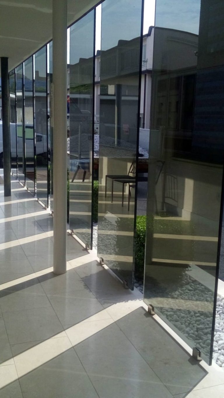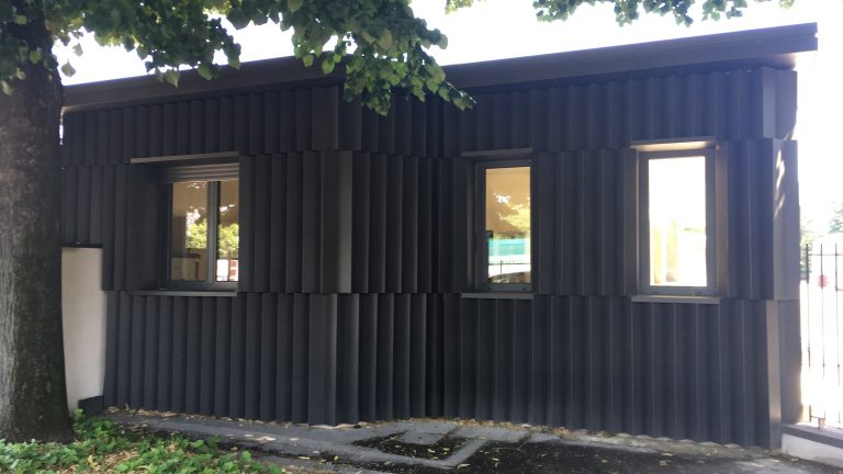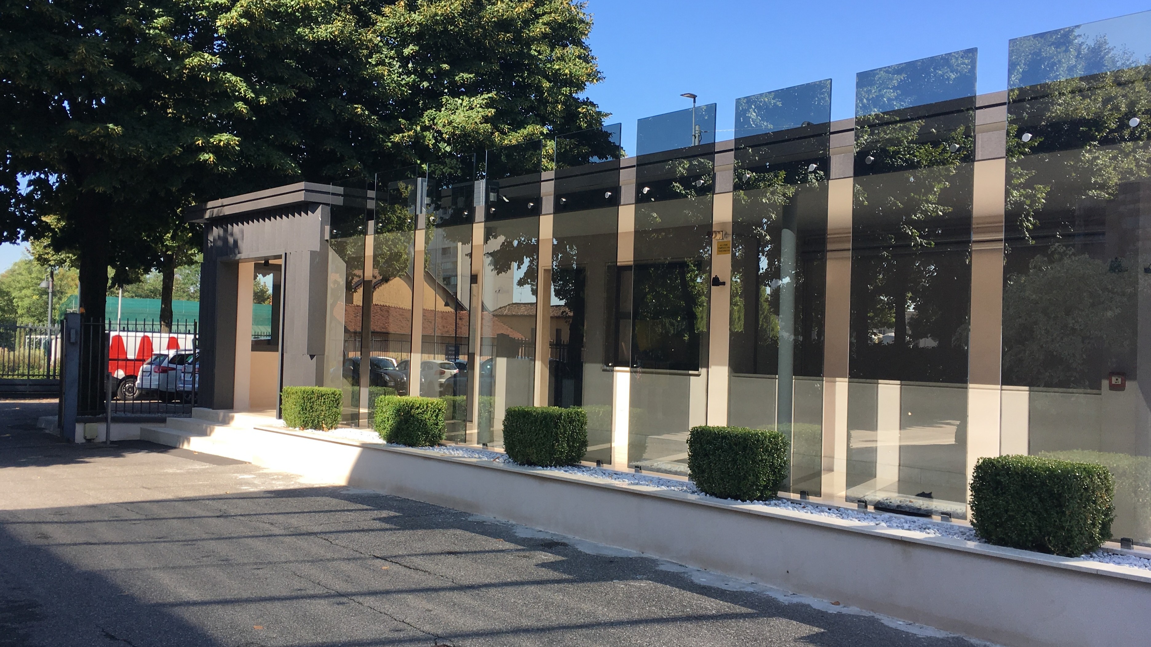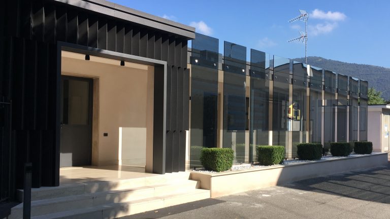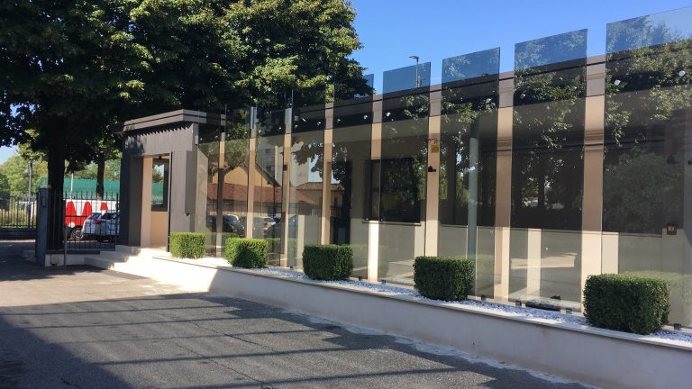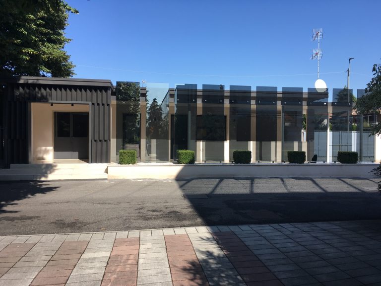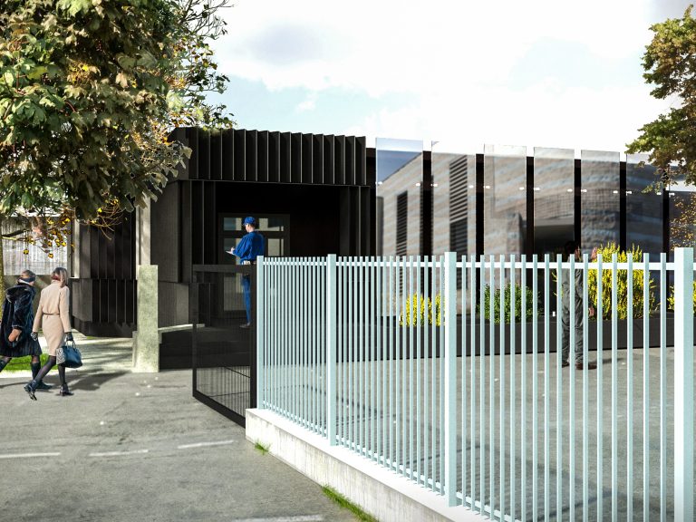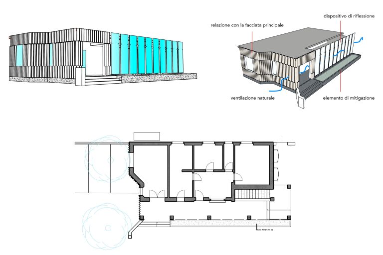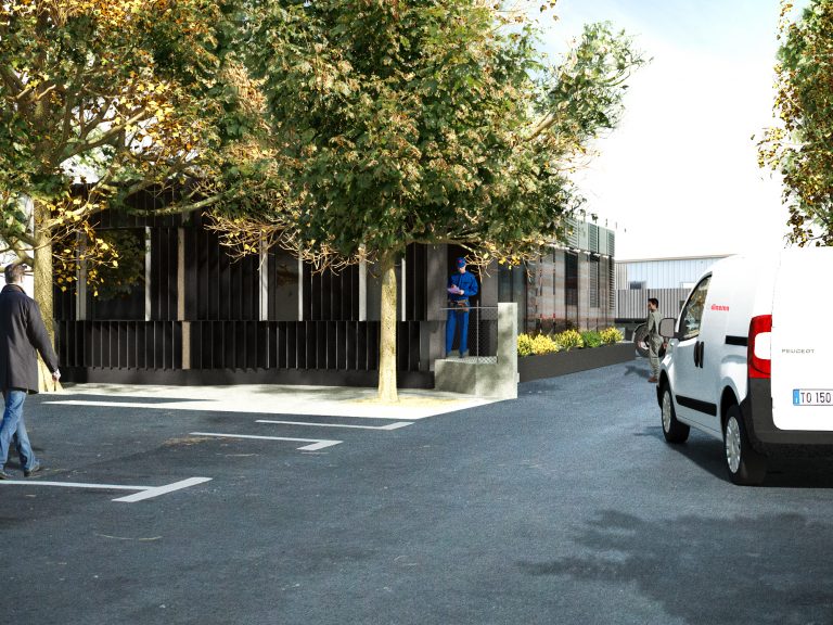 Il progetto prevede un restyling delle facciate del fabbricato, attraverso un intervento leggero con montaggio “a secco” realizzato con lamiere presso piegate verniciate nella parte in ingresso allo stabilimento e con un paramento in lastre di vetro per la parte più interna in corrispondenza del passaggio coperto.
